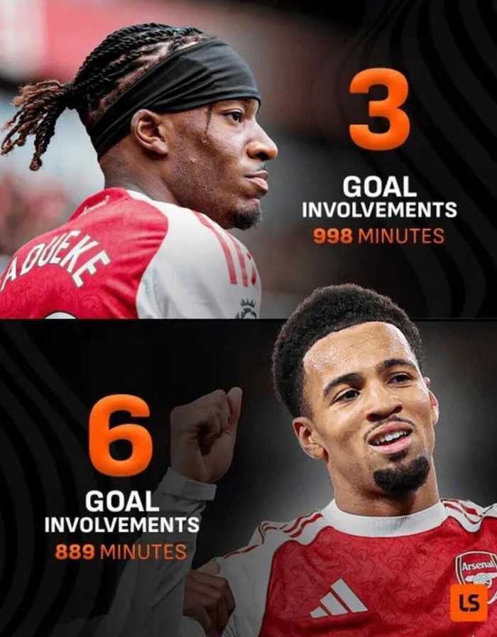 马杜埃凯998分钟仅造3球,恩瓦内里889分钟参与6球 发布时间:22/04/2026, 16:44:23 livescore发布一张数据对比图,阿森纳边锋马杜埃凯本赛季联赛出场时间达998分钟,但仅直接参与3粒进球。 相比之下,阿森纳小将恩瓦内里上赛季虽然只踢了889分钟,却已经参与了6粒进球,效率几乎是前者的两倍。 标签: 乐球直播网